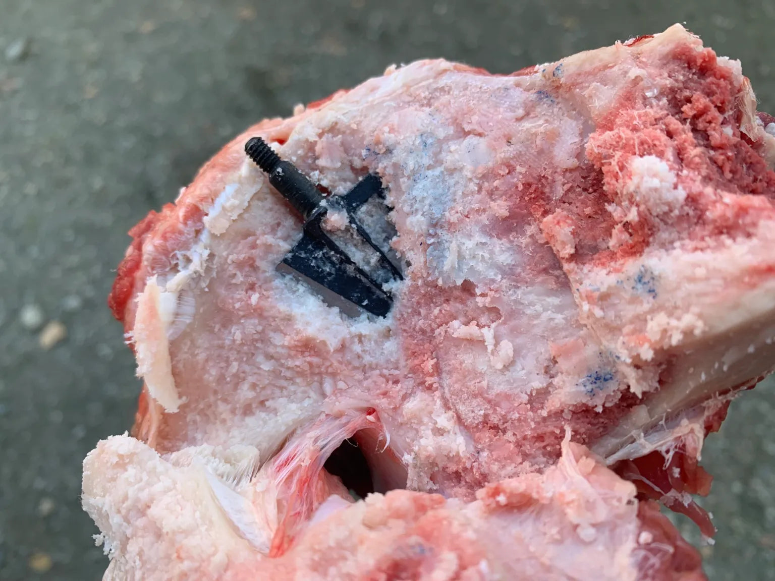 I shot both the standard and wide-cut Cutthroats into the heavy moose leg bones, and both buried completely up to the arrow. The bone rolled edges on the wide cut point, but it was still serviceable. I shot a 150-grain standard Cutthroat from my 70-pound compound with a 650-grain arrow directly into the ball at the top of the front leg bone (the one that the scapula connects to). It’s essentially four inches of solid bone, and I had to chisel the bone apart to retrieve my point. The edge took no discernable damage and was still shaving sharp.